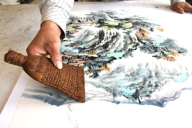 “机器生产的千篇一律,是个产品、商品。手工的每一个作品都是唯一的,不可复制的,”孙京善说。当下,机器绘画、数字艺术浪潮袭来,平度指画却有着独特“不可替代性”。指画以手指为创作工具,创作者巧妙利用指纹纹理、力度变化、手部细微颤抖等身体本能,自然融入画面,干湿、浓淡、肌理构成独一无二的身体记忆,手指画的价值不在于技术的精密程度,而在于其承载的人性温度,这是机器难以模拟的核心特质。