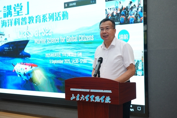 2025年9月5日下午,由中国大洋事务管理局、国家深海基地管理中心、香港科技大学联合主办,青岛市科协、即墨区科协等多家单位协办的“蛟龙探海,逐梦深蓝”深海课堂——中国大洋92航次一船三地科普活动成功举办。中国大洋事务管理局副局长唐冬梅,国家深海基地管理中心副主任丁忠军、香港科技大学协理副校长童彭尔、钱培元教授、中银香港个金产品总经理周国昌先生、青岛市科学技术协会党组书记、主席王崇江等出席现场活动,国家深海基地管理中心孙永福研究员主持活动。来自北京一零一中学、香港仁济医院第二中学以及青岛蓝谷中学、青岛市即墨区蓝谷实验中学等十余所中小学共700余名师生参与了活动。