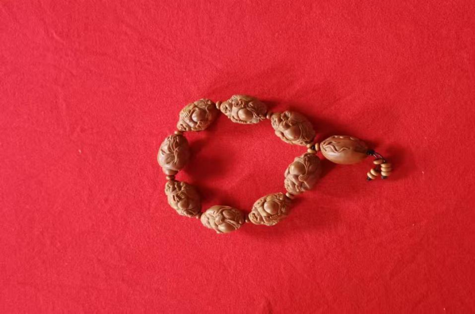 随着创作的深入,肖丕习的材料早已跳出桃核的局限,杏核、核桃、橄榄核皆成载体,其中橄榄核因质地坚硬、纹理细腻,逐渐成为主要原料。他依据果核的形状大小,或雕单件,或制手串,让核雕艺术从简朴走向繁复精微。