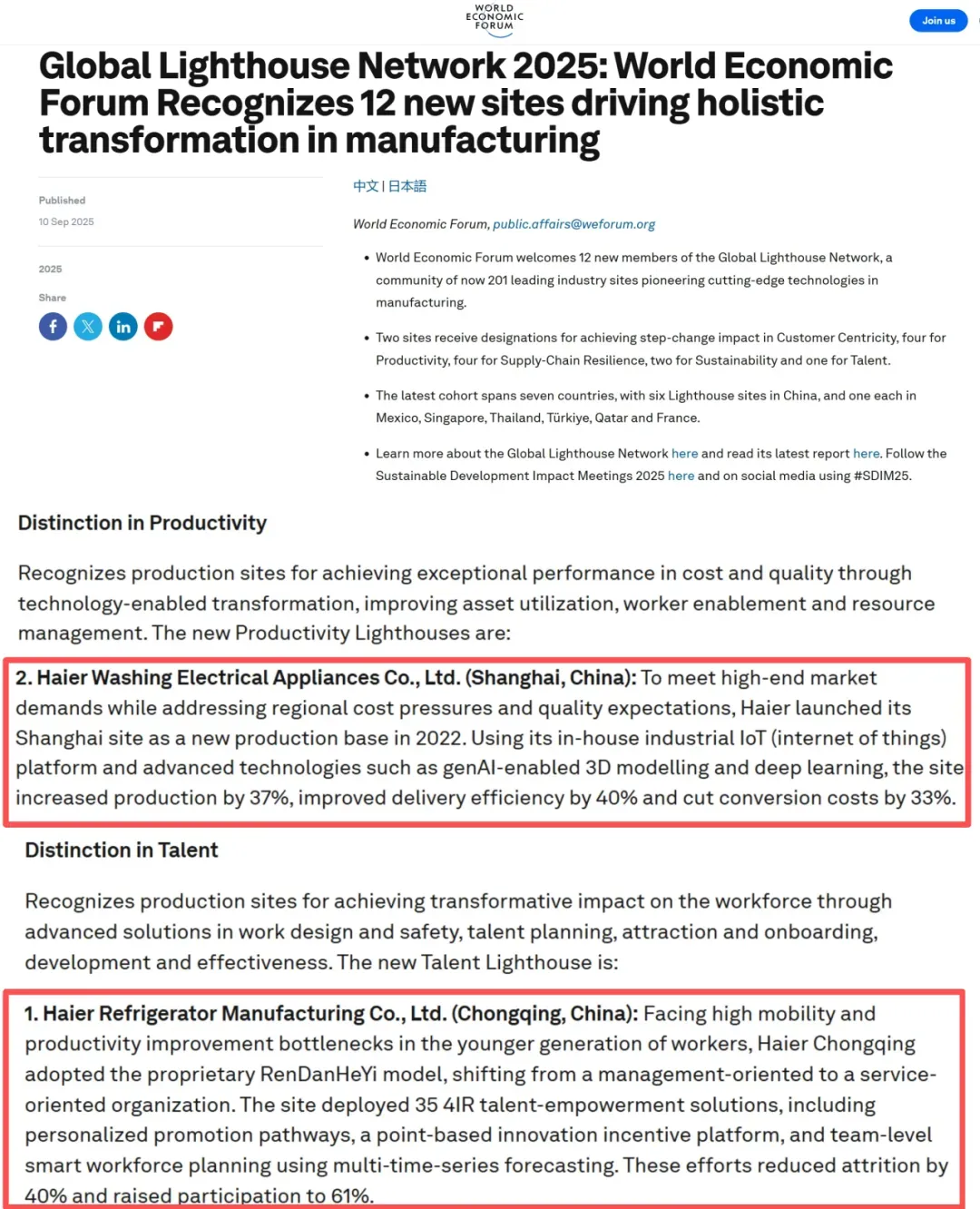其中,海尔重庆冰箱互联工厂是全球首个“人才灯塔”,而包括电力设备、工业衡器行业2家龙头企业也成为各自行业首座灯塔工厂,填补国际空白,成为AI时代的“灯塔标杆”。