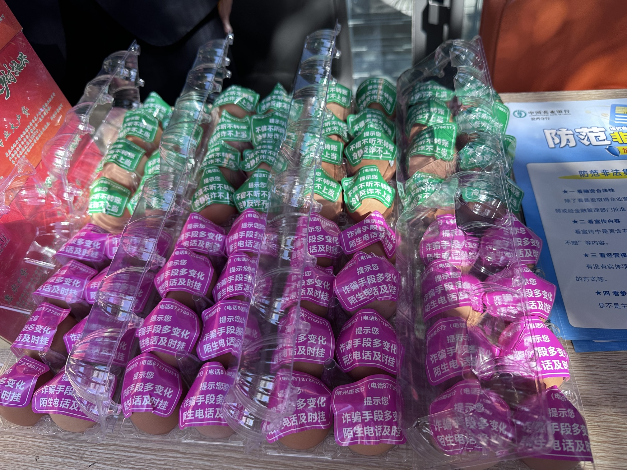 本次活动准备了富有创意的宣传礼品:每颗鸡蛋上都贴着“不信不听不转账,冷静反诈不上当”、“诈骗手段多变化,陌生电话及时挂”的反诈小贴士;抽纸包装上也印有胶州农行各网点的联系电话以备社区居民及时联系。活动现场气氛热烈,不断有居民闻讯赶来,党群工作人员贴心地为每位参与活动的老人介绍活动,银行工作人员则耐心解答各种疑问。