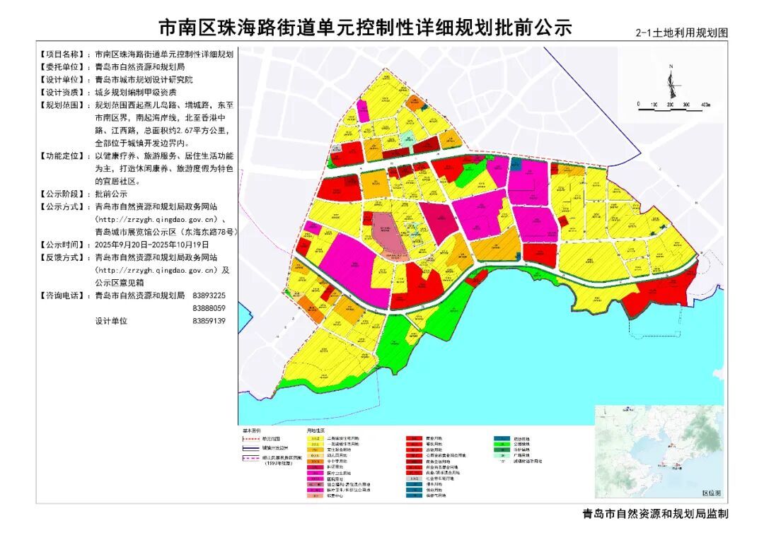 其中,珠海路街道单元规划范围西起燕儿岛路、增城路,东至市南区界,南起海岸线,北至香港中路、江西路,总面积约2.67平方公里,全部位于城镇开发边界内。功能定位为以健康疗养、旅游服务、居住生活功能为主,打造休闲康养、旅游度假为特色的宜居社区。