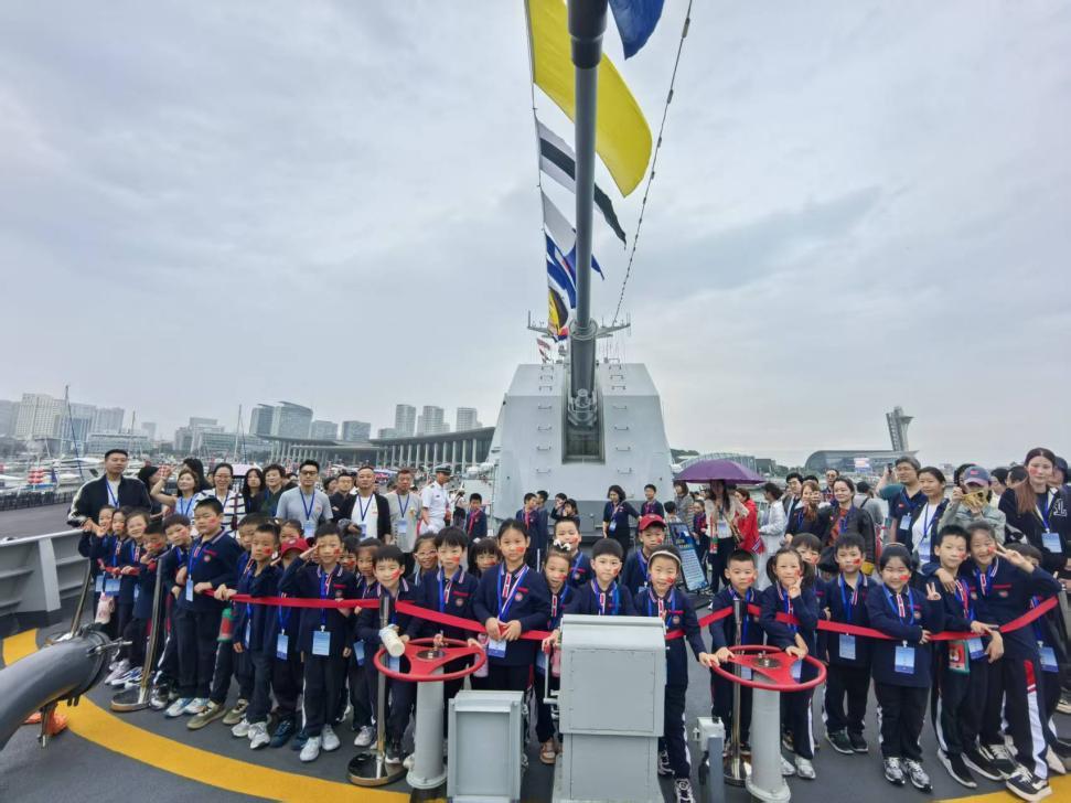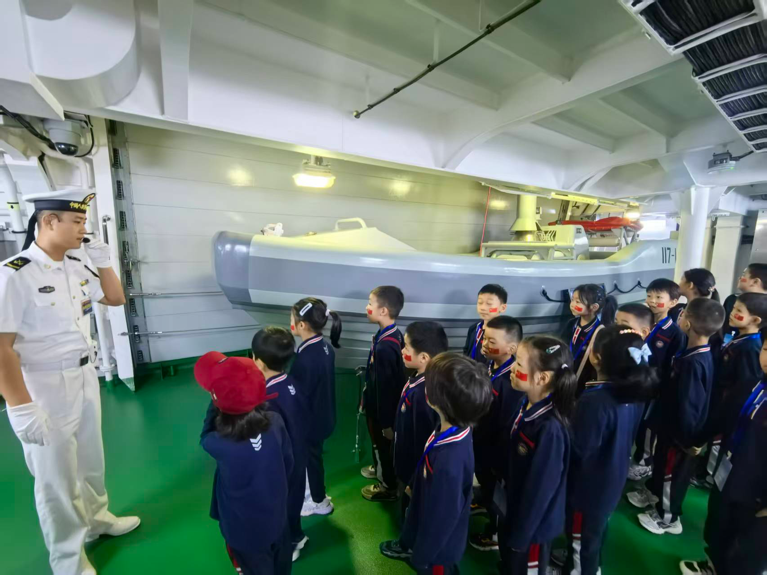 少先队员们依次排队登船参观,一睹大国重器的风采。踏上甲板的那一刻,气势磅礴的舰体、先进的装备、光洁如镜的甲板,无不给队员们带来了强烈的视觉冲击力和心灵震撼,队员们眼中满是好奇与崇敬,在海军叔叔的引导讲解下,大家切身感受到了大国重器所承载的科技力量与战略意义。参观舰艇后,队员们还在码头上学习体验了系绳结、打旗语、穿戴防火服和潜水装具等海军专属技能。