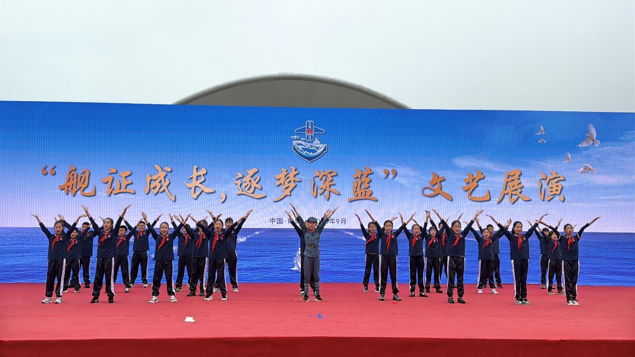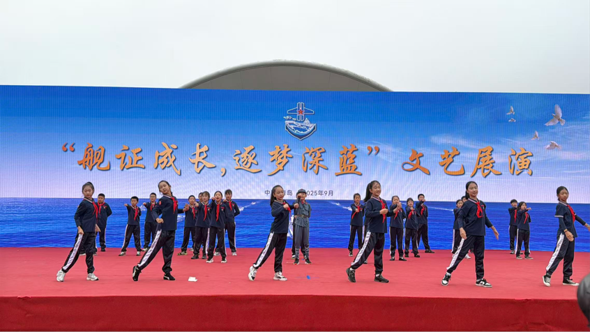 在“舰证成长,逐梦深蓝”青岛市中小学生文艺展演现场,五•5中队的孩子们将合唱《强军战歌》与穿越短剧巧妙融合,精彩的表演,赢得了现场观众的阵阵掌声,得到了军地有关领导的一致好评。