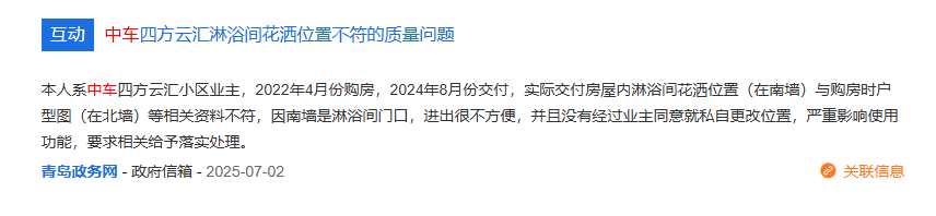 近期,中车四方云汇项目再因交房质量和停车场收费问题被业主投诉。2025年7月,有业主反映其在2022年4月购房,2024年8月交付,但实际交付房屋内淋浴间花洒位置(在南墙)与购房时户型图(在北墙)等相关资料不符,开发商未经同意私自更改位置,严重影响使用功能。