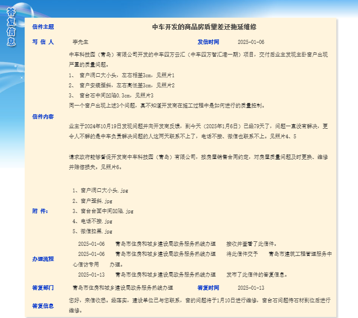 2025年1月,有业主投诉中车四方云汇(中车四方智汇港一期)项目,交付后主卧窗户出现严重质量问题。此前业主已于2024年10月向开发商反馈,但问题一直未解决,且联系不上负责人。