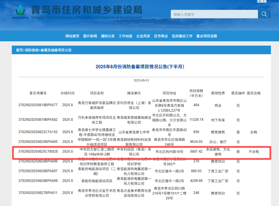 其中,两个项目被抽检,由中车科技园(青岛)有限公司建设的中车四方智汇港二期项目-109a地块-2期消防备案结果不合格。
