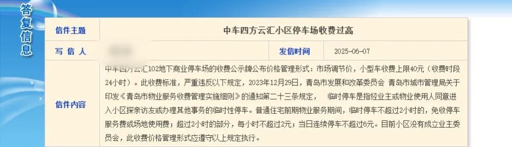 今年6月,有业主投诉中车四方云汇小区停车场收费过高。四方中车云汇小区配套停车位的一部分(约180个)划定为“商业停车停车场”并收取高价费用,违背青岛市城市管理局和青岛市发改局的租赁车位310元/月的指导价格。该业主称,开发商把配套停车场划分为所谓的“商业停车场”,收取业主高额费用,明显违背相关规定损害业主利益,根据相关规定,开发商在出售、附赠或出租车位时,必须优先考虑小区业主的使用需求。