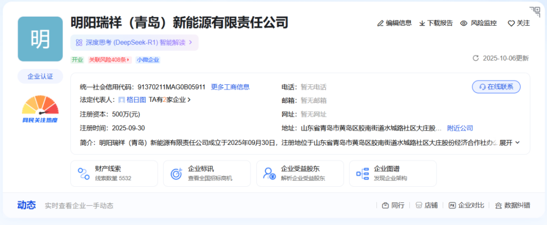 如今,明阳瑞祥(青岛)新能源有限责任公司成立,法定代表人为格日图,注册资本500万人民币,业务范围涵盖风力发电技术服务、海上风力发电机组销售、风力发电机组及零部件销售等多个领域。