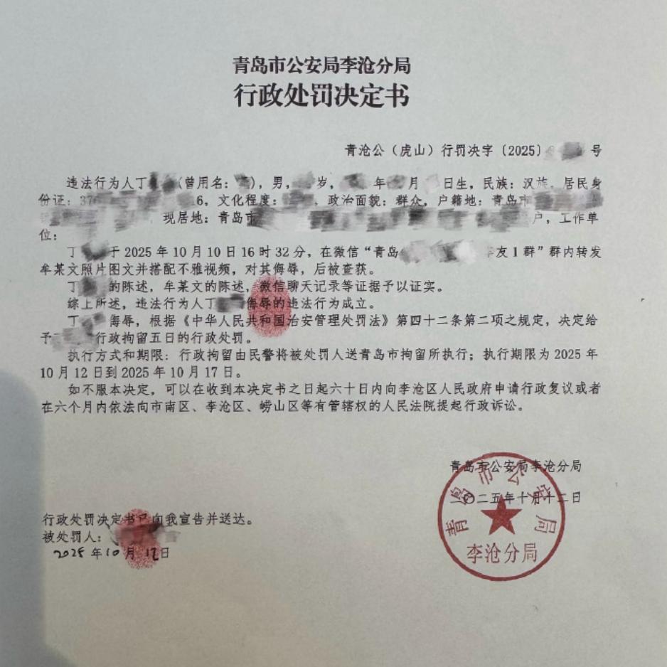 10月12日,青岛保时捷女销冠牟女士在社交平台晒出青岛市公安局李沧分局行政处罚决定书。行政处罚决定书显示,一男子在群内转发牟某文照片图文并搭配不雅视频,对其侮辱,后被查获。根据《中华人民共和国治安管理处罚法》第四十二条第二项之规定,决定给予行政拘留五日的行政处罚。