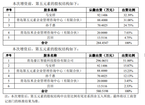 历经一个多月的争议,青岛豪江智能科技股份有限公司(以下简称“豪江智能”)以510万元自有资金投资入股青岛第五元素科技有限公司(以下简称“第五元素”)的动作,已经完成。