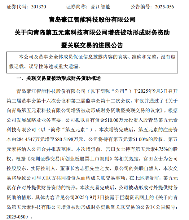 据悉,本次增资前,宫田持有第五元素4.75%的股权,其为豪江智能控股股东、实际控制人、董事长宫志强之女,系公司的关联自然人,因而本次交易将导致豪江智能与关联方共同投资构成关联交易事项。