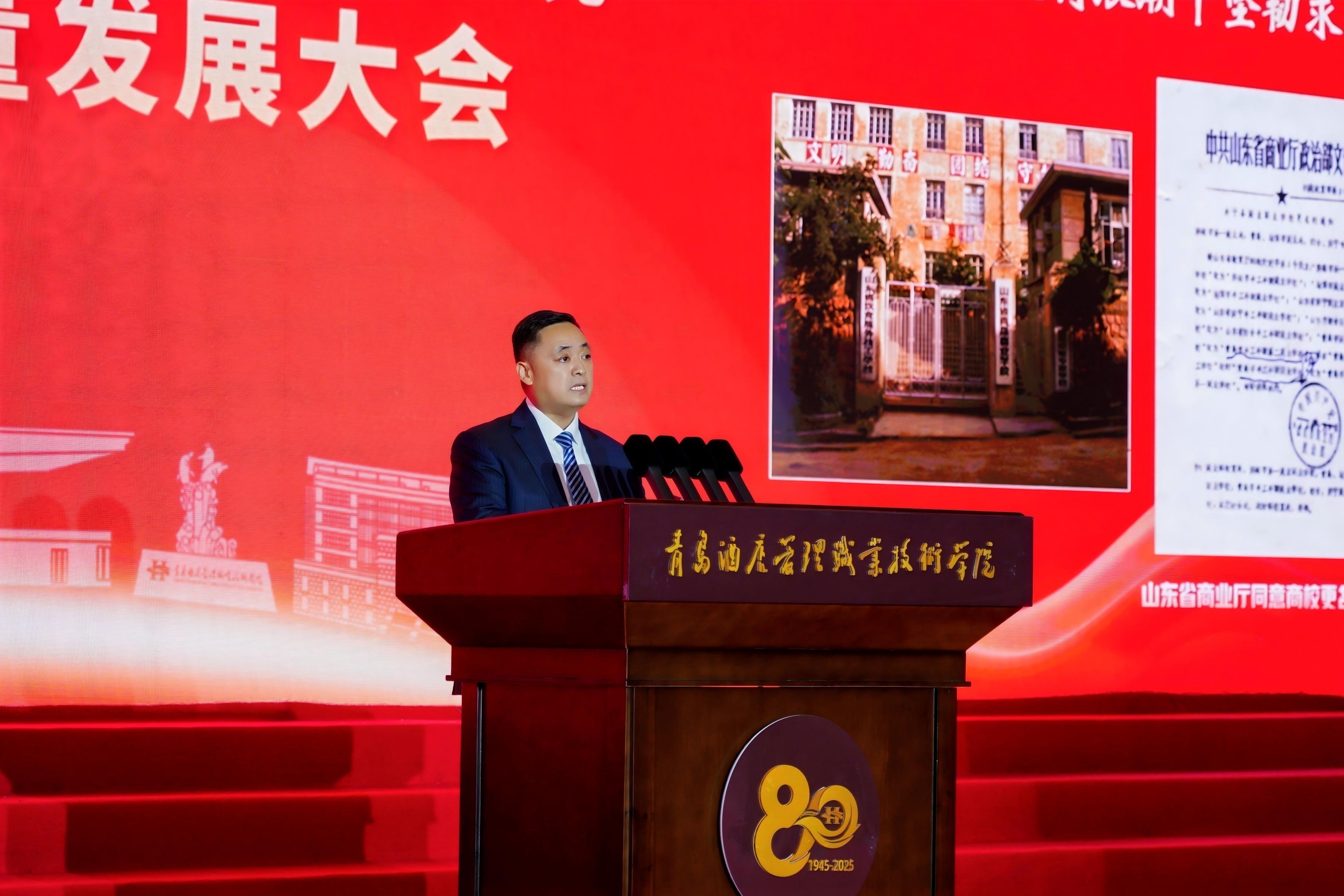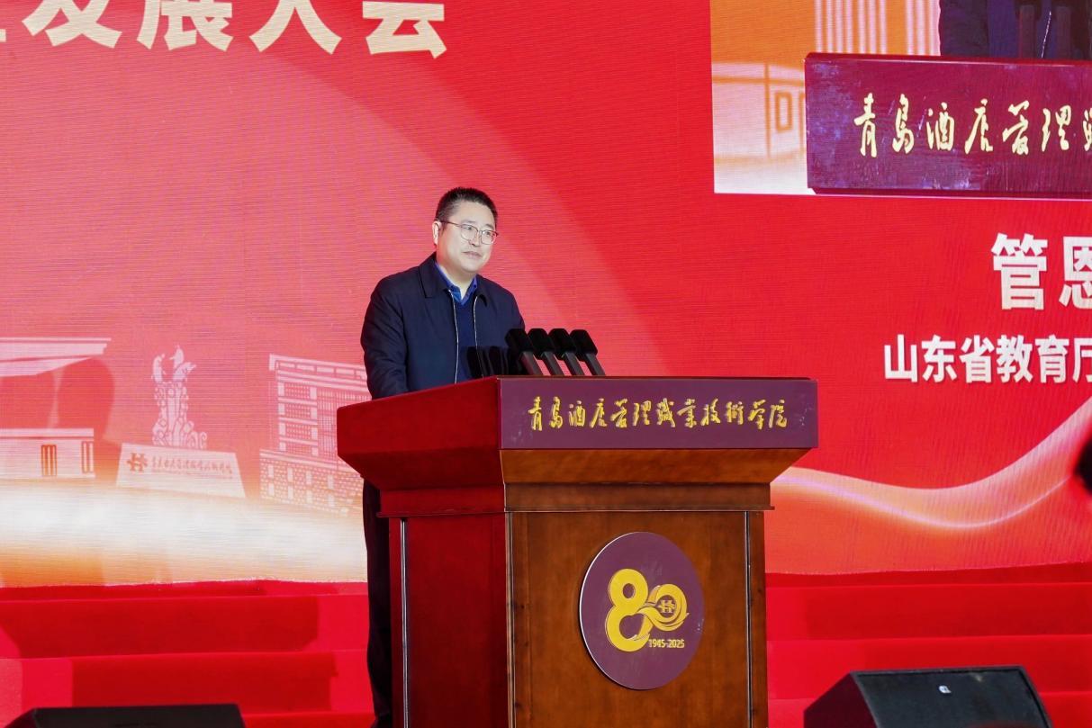 管恩文代表山东省教育厅致辞。他指出,近年来,全省职业教育紧紧围绕服务国家重大战略和山东经济社会发展,不断迭代升级、提质增效。青岛酒店管理职业技术学院作为我国第一所独立设置的酒店管理职业技术学院,始终坚持为党育人、为国育才的社会主义办学方向,落实立德树人根本任务,积极服务行业改革发展和我省经济建设需要,形成了以住宿餐饮业的智能化、数字化转型升级为主线的专业群建设体系,为全国服务行业培养了一大批优秀的技术技能人才。他希望学校以建校80周年为契机,勇担新使命,展现新作为,坚持立德树人,筑牢育人根基;深化内涵建设,提升办学质量;深化产教融合,增强服务能力;推进数字化转型,赋能教学创新;扩大对外开放,提升国际影响力。