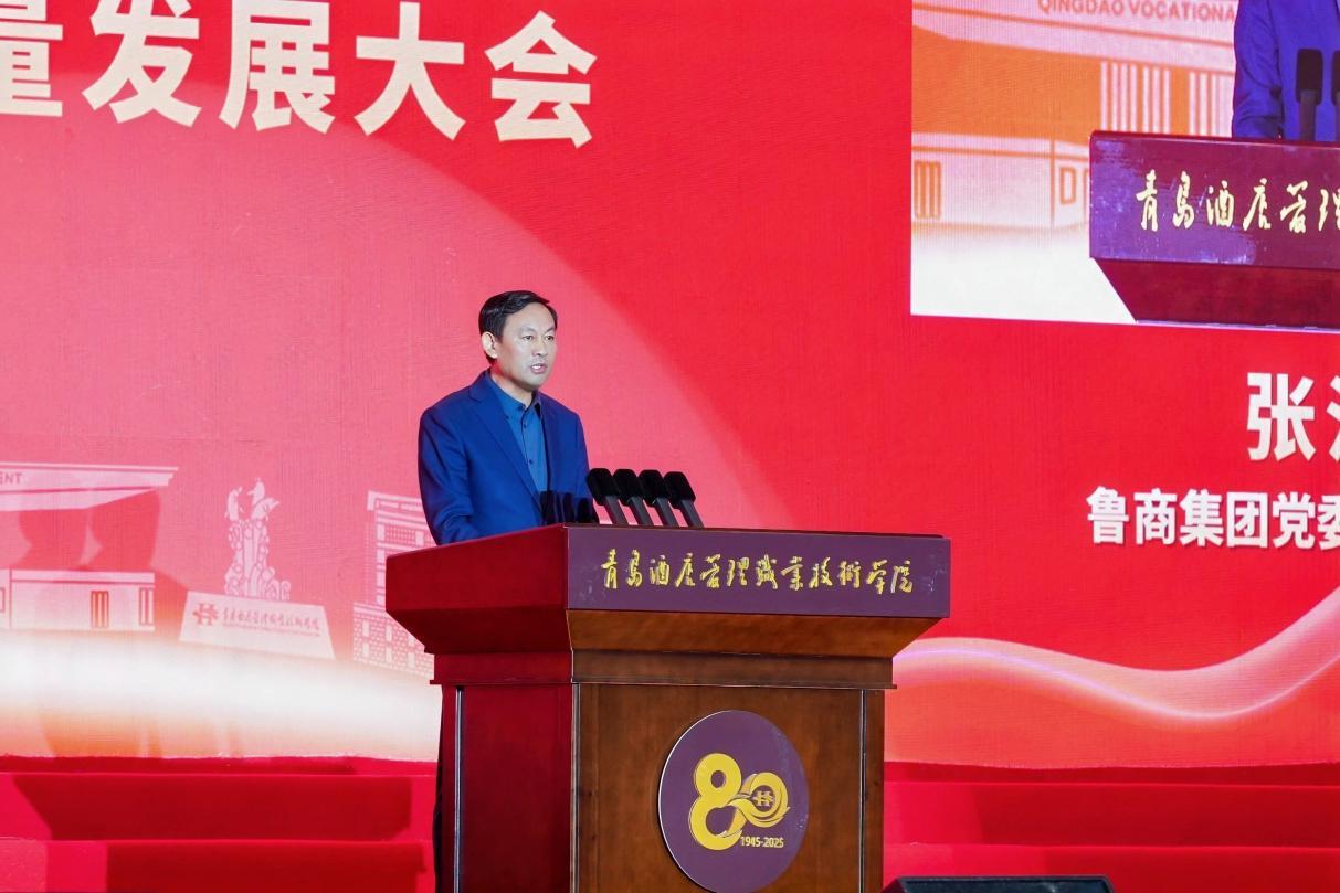 张洪东代表鲁商集团致辞。他指出,鲁商集团始终把教育作为战略支点和社会责任的重要载体,坚持把以“打造具有鲁商特色的教育板块一体化发展新格局”为引领,写入集团“十五五”发展规划,统筹推进产教融合、校企合作,推动院校与产业双向赋能、协同发展。他希望学校以80周年校庆为新的起点,在省委省政府、省国资委和集团党委的坚强领导下,勇担时代使命,坚守立德树人初心,准确把握职业教育发展的新形势、新任务、新要求,坚定不移走特色发展、创新发展、高质量发展之路,努力培养更多高素质技术技能人才、能工巧匠、大国工匠,为发展现代职业教育、加快建设教育强国作出新的更大贡献。