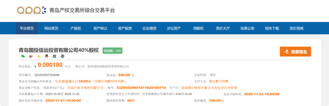 10月下旬,青岛产权交易所一则股权转让公告引发市场关注:青岛国投信远投资有限公司(下称“国投信远”)40%股权以1元底价挂牌转让,竞价开始时间为11月21日。