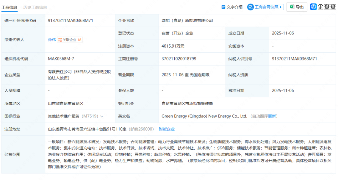 企查查信息显示,一家名为绿能(青岛)新能源有限公司(以下简称“绿能青岛”)的新企业在青岛市黄岛区正式注册成立,这家注册资本超过4000万元的企业由国电电力发展股份有限公司(以下简称“国电电力”)间接全资持股,业务覆盖生物质能、海水淡化、风力发电、太阳能发电及集中式快速充电站等多个领域。