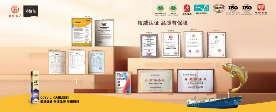 国信水产以科技创新为核心支撑,构建从育苗、养殖到生产、销售的全流程标准化体系,重新定义高端水产品质标杆。核心产品“国信水产・裕鲜舫”深海野游大黄鱼,依托深远海工船可控养殖环境,实现全年稳定供应,凭借“野生级口感、标准化品质”赢得市场广泛青睐。该产品不仅成功入选山东高端品牌培育名单,斩获国家级“特质农品”“名特优新”等多项荣誉,更通过ASC、HACCP等国际权威认证,品质与安全获得全球市场认可。