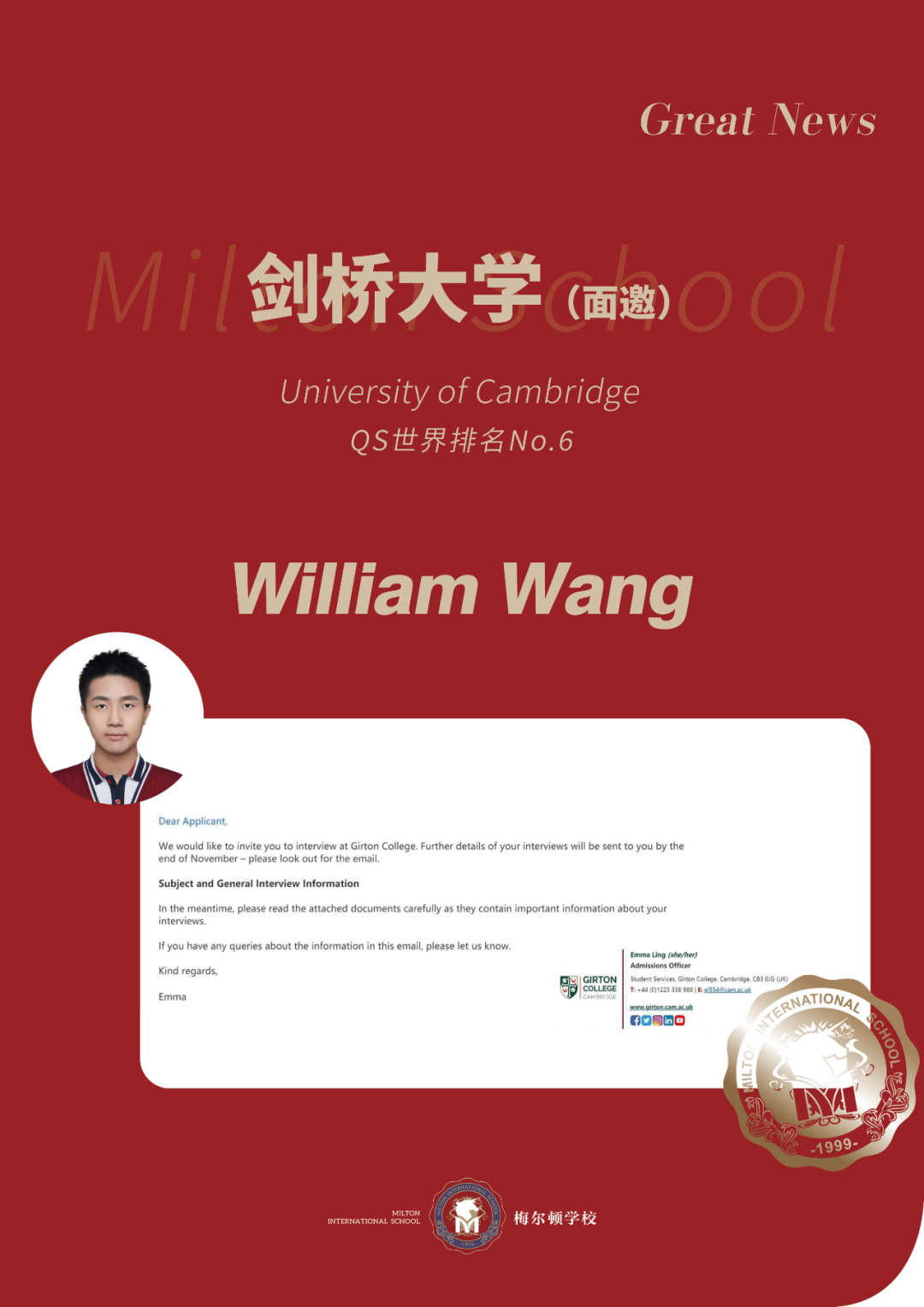 我们为William Wang同学感到无比自豪,并期待他在接下来的面试中继续展现梅尔顿学子的风采,勇攀高峰,再创佳绩!