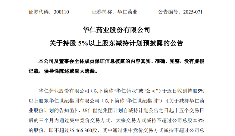 以当日3.62元/股的收盘价计算,本次顶格减持可套现1.28亿元。这并非华仁世纪集团年内首次减持,早在7月,其就已通过集中竞价方式减持1%股份,获得近4000万元资金。