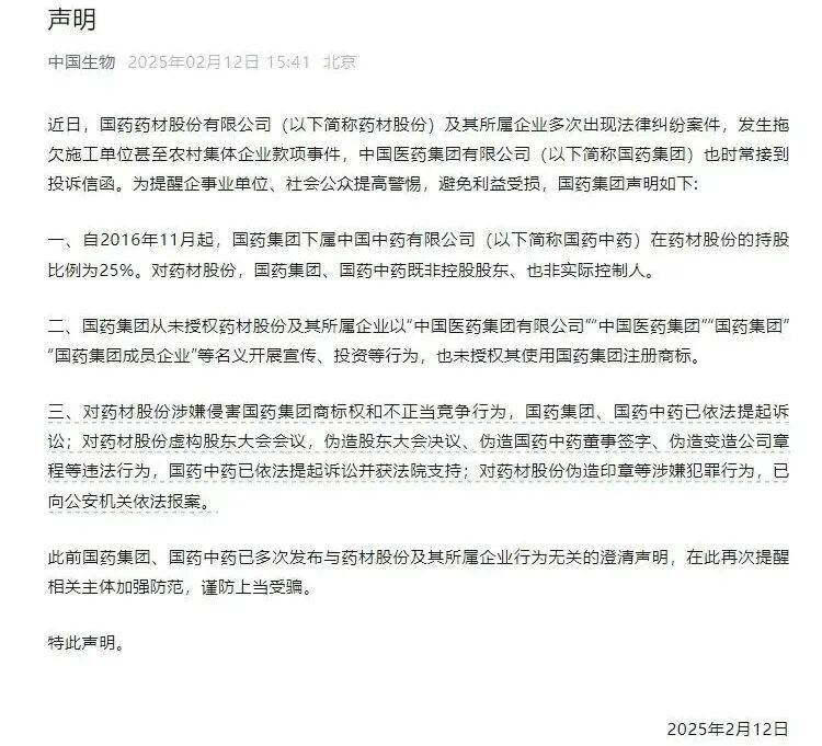 合作期间,国药集团及其控股上市平台中国中药曾多次公开声明:药材股份不是其控股或实际控制企业,亦未授权其对外使用“国药集团”的名义开展经营。