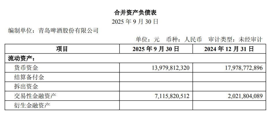 从资金状况来看,青岛啤酒具备开展大规模理财投资的基础。截至2025年9月30日,公司货币资金达139.8亿元,交易性金融资产也达到了71.2亿元,二者合计211亿元,并且公司没有长短期借款。