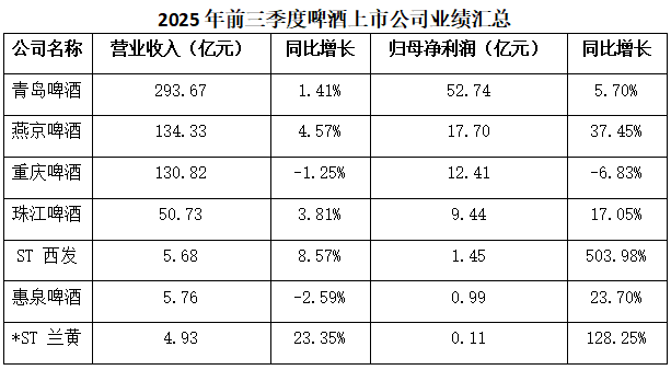 2025年前三季度,A股7家啤酒上市公司,分别为青岛啤酒、燕京啤酒、重庆啤酒、珠江啤酒、ST西发、惠泉啤酒、*ST兰黄,整体呈现“盈利普增、分化加剧”的格局。