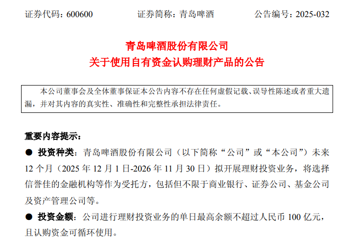 11月27日,青岛啤酒股份有限公司(以下简称“青岛啤酒”)宣布拟使用不超过100亿元自有资金开展理财投资业务,期限为2025年12月1日至2026年11月30日。