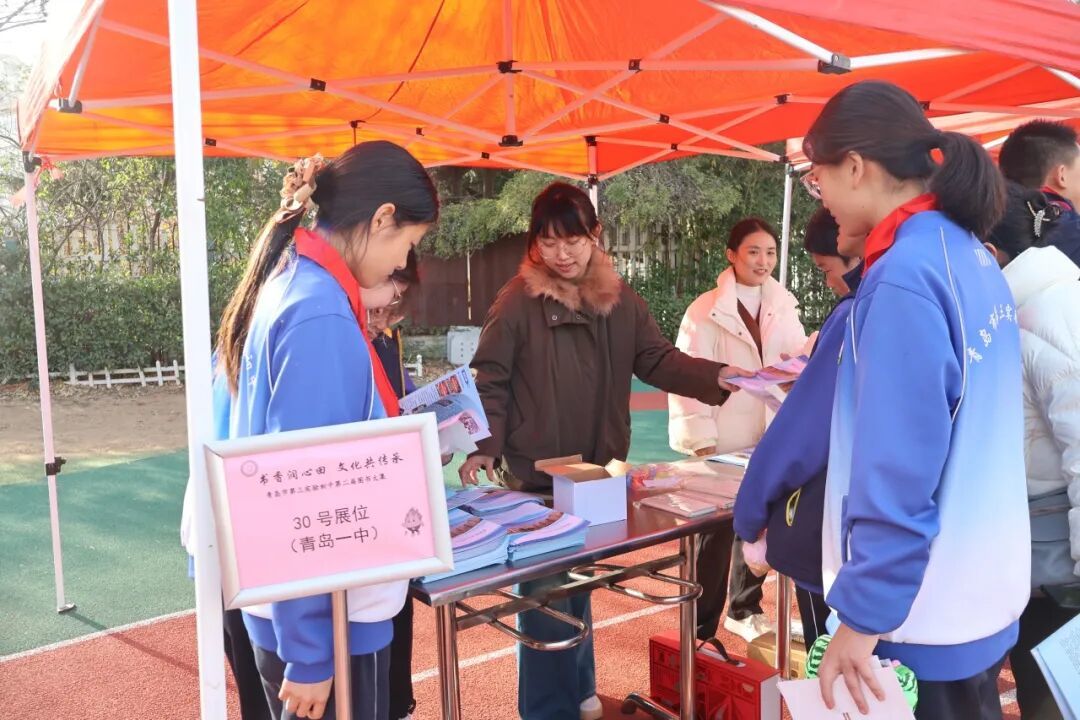 青岛南京路小学带来了充满童趣的绘本阅读推荐与互动讲故事环节;青岛澳门路小学展示了与阅读相结合的创意手工与思维导图作品;青岛福林小学巧妙地将古典诗文意境与传统漆扇工艺相结合,现场演示如何在素扇上题写经典诗句并施以漆艺,古韵今风,雅致非常,为整个大集增添了一抹独特的传统文化韵味,让师生们在美的享受中感悟文学与工艺的双重魅力。不同学段间的文化展示与交流互动自然融洽,共同勾勒出一幅教育衔接、文化共融的生动图景。