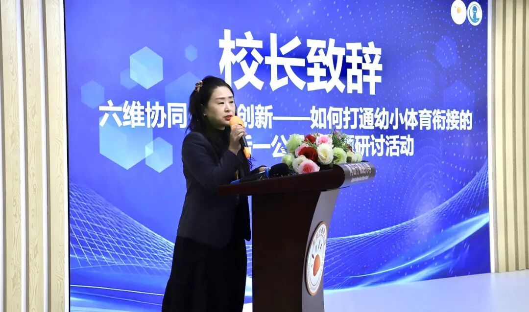 青岛宁德路小学王妮妮校长进行致辞,她结合学校在幼小衔接领域的长期探索与实践积淀,从“育人一体化”的教育理念出发,系统阐明了学校对构建体育幼小衔接新样态的整体构想与长远愿景。