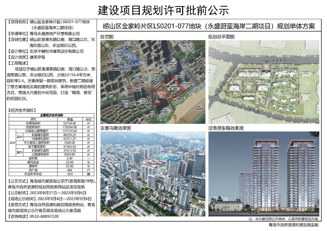 2023年8月,青岛市自然资源和规划局披露永盛蔚蓝海岸二期规划,由青岛永盛房地产开发有限公司建设,其控股股东鲁信置业正式接手该地块。