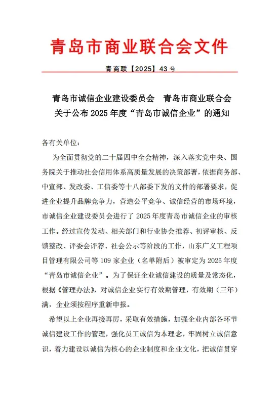 为全面贯彻党的二十届四中全会精神,深入落实党中央、国务院关于推动社会信用体系高质量发展的决策部署,促进企业提升品牌竞争力,营造公平竞争、诚信经营的市场环境。近日,青岛市诚信企业建设委员会、青岛市商业联合会公布了2025年度“青岛市诚信企业”名单,青岛开投集团旗下捷能集团、华欧集团、建协检测站等12家企业荣登榜单。