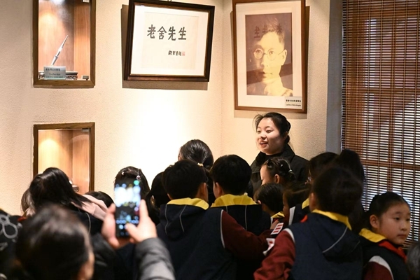 在黄县路12号骆驼祥子博物馆,古朴的砖木小楼瞬间将大家带入20世纪30年代的时光。展柜里泛黄的手稿复印件、不同版本的《骆驼祥子》著作、老舍先生使用过的书桌与笔墨,无声诉说着文学巨匠的创作日常。“原来这部影响几代人的小说,诞生在咱们市南的小巷里,太自豪了!”居民李女士一边仔细观看展品,一边与身旁的同伴分享感慨。