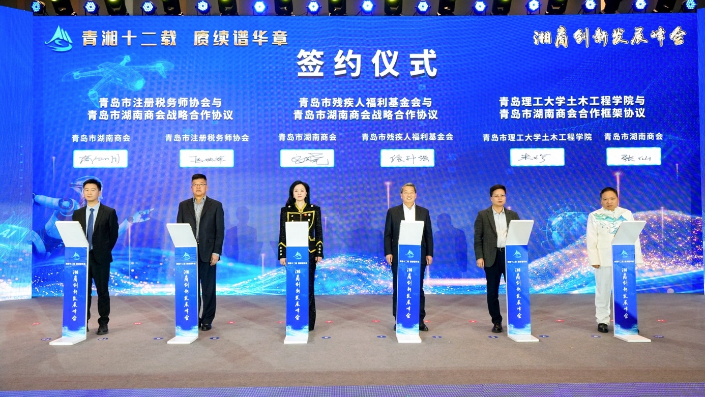 独行快,众行远。为推动资源共享、优势互补,实现更广范围的合作共赢,大会现场,青岛市湖南商会分别与青岛市残疾人福利基金会、青岛市注册税务师协会、青岛理工大学土木工程学院签署战略合作协议,将在公益慈善、税务合规、打通“产学研用”链条等领域开展深度合作,构筑起商会为会员企业提供社会责任、稳健经营、技术创新全方位赋能的战略布局。现场,商会还向青岛市残疾人福利基金会捐赠了爱心物资,践行湘商“心忧天下”的社会责任。