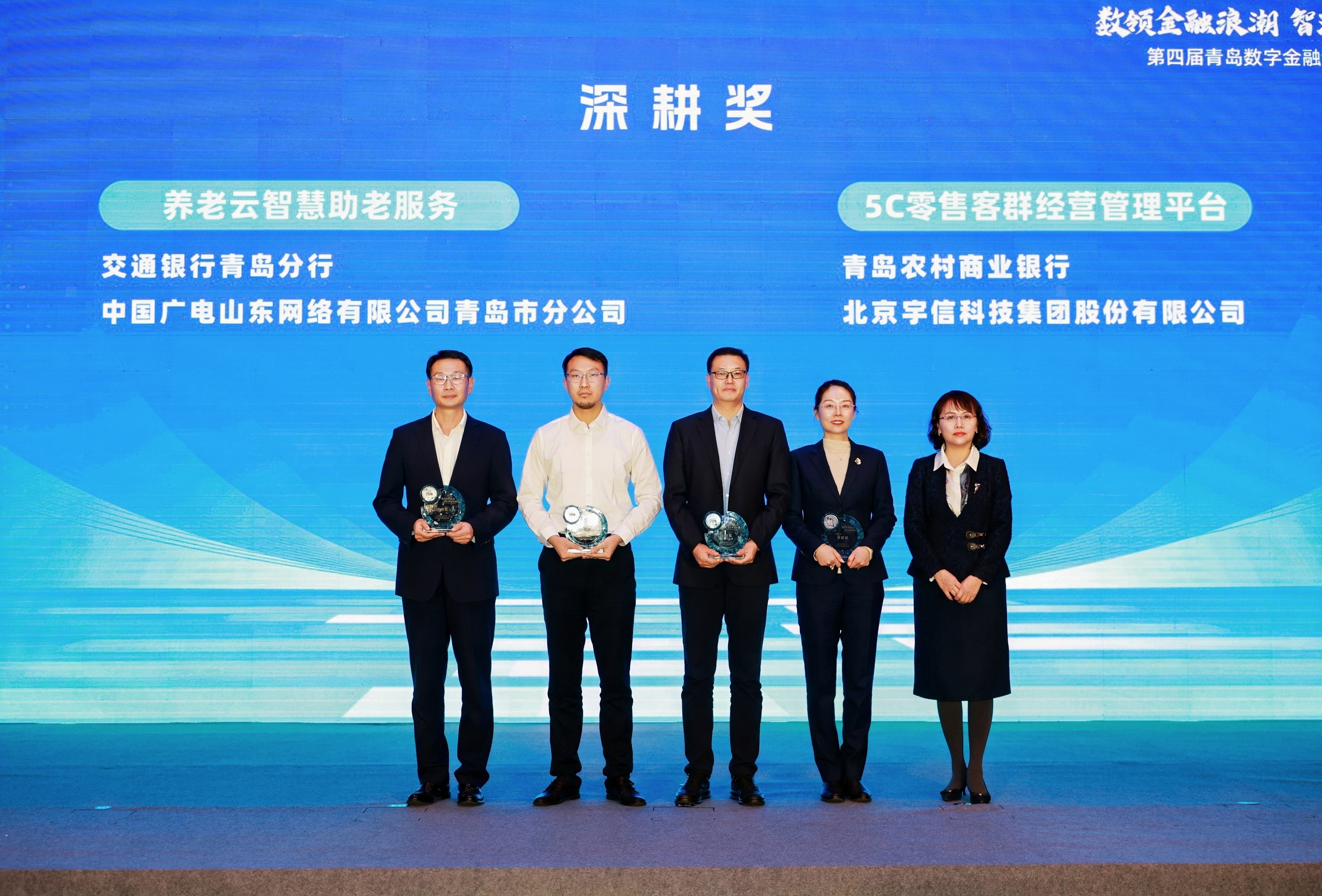 特别值得一提的是,本届大赛在关注“创新增量”的同时,延续前几届设立的“深耕奖”,授予往届获奖并已投入实际应用、取得显著成效的项目,旨在破除“为赛而赛”的短期行为,确立“以用为本、长期主义”的创新风向标。本届深耕奖项目为上一届获奖的交通银行青岛分行与中国广电山东网络有限公司青岛市分公司共建的“养老云智慧助老服务”,以及青岛农村商业银行与北京宇信科技集团股份有限公司共建的“5C零售客群经营管理平台”。这两个项目经历从概念验证到场景落地的完整周期,经受住实践检验,证明数字金融创新只有扎根场景、深耕细作,才能真正转化为现实生产力。