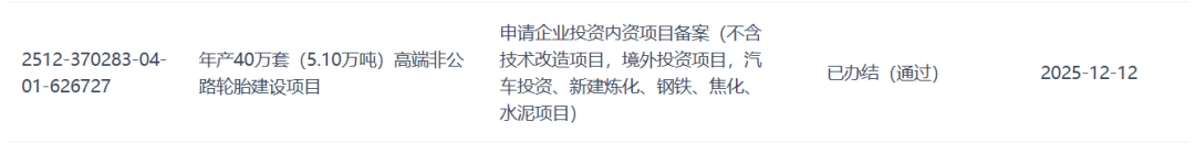 以青岛企业赛轮轮胎为例,一个月前,赛轮集团旗下诸城涌安橡胶科技有限公司一项年产5.14万吨高端非公路轮胎项目,在山东省投资主管部门完成备案。