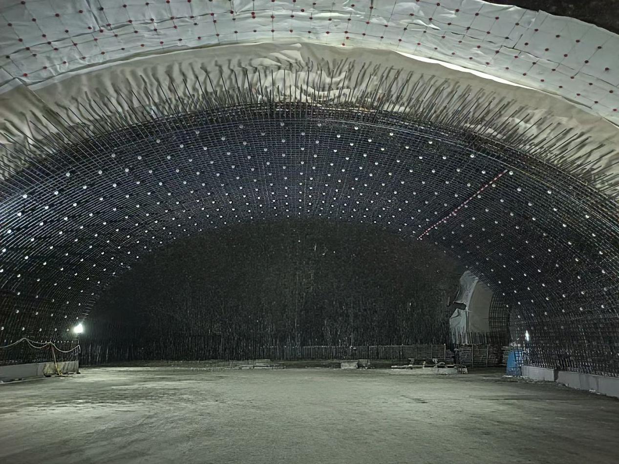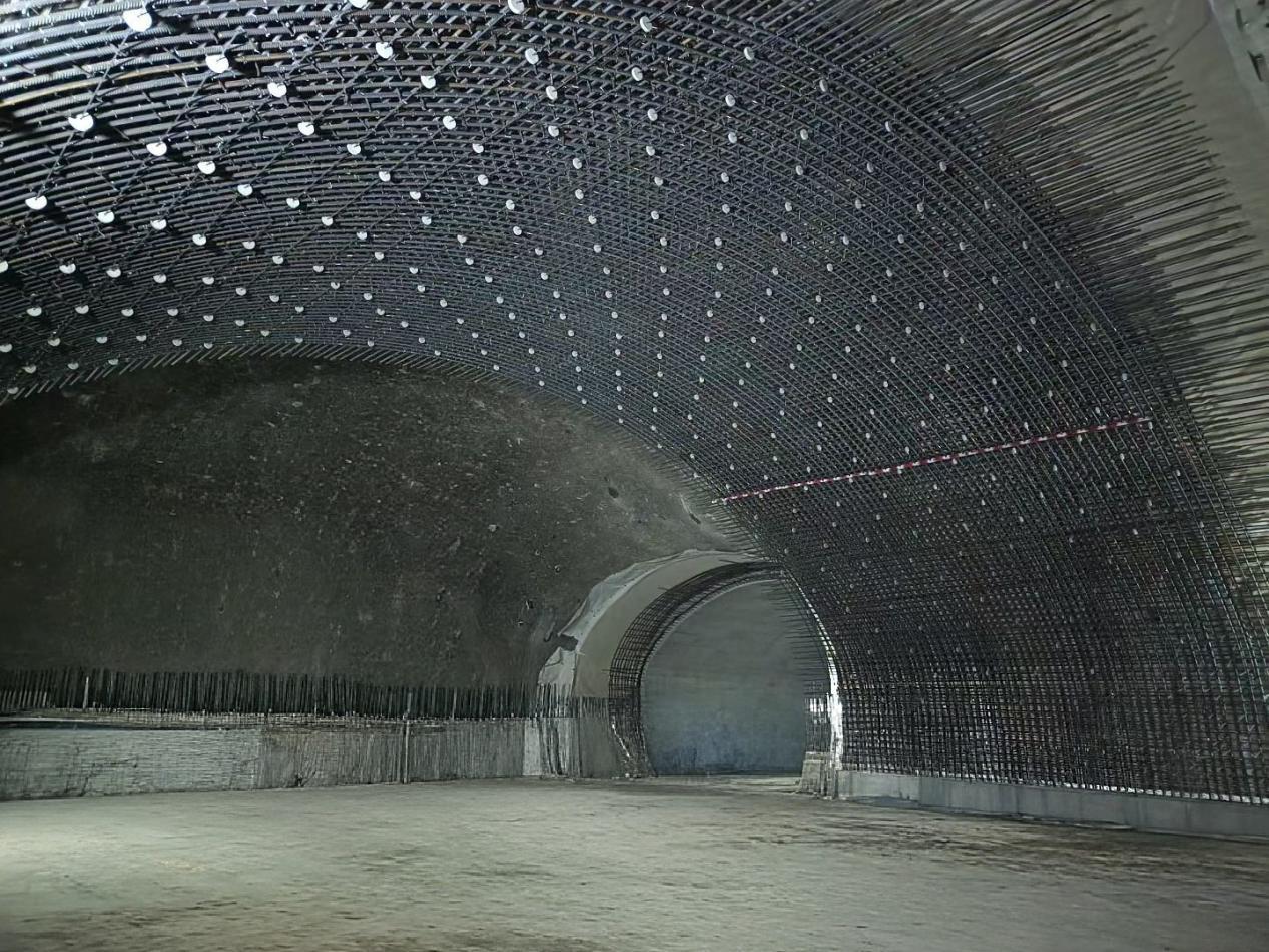 车站内拱墙之上,成排的钢筋纵横交错,像是给隧道撑起了一副黑色的骨架。而那些拳头大小的白色混凝土垫块,正嵌在钢筋的缝隙里——它们本该是毫不起眼的“配角”,隔开钢筋与模板、保证混凝土保护层厚度,是建筑规范里最普通的存在。可当数百个垫块沿着拱顶的弧度铺陈开,灯光扫过的瞬间,竟真的有了“星子垂落”的错觉,深灰的岩壁是夜幕,银黑的钢筋是星河的轨道,而那点点莹白,就是被镶嵌在钢筋骨架里的满天星。