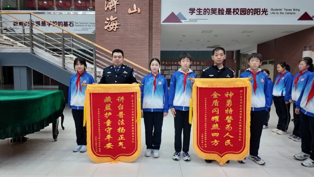 活动尾声,少先队员代表怀着崇敬之心向特警叔叔们献上锦旗,全体队员齐声喊出“警察叔叔,您辛苦了!节日快乐!”的真挚祝福,用最质朴的语言传递感恩之情。此次活动更促成长效育人机制的建立——中队聘任民警为“少先队校外辅导员”,后续将定期开展“民警进校园”活动;同时组建“红领巾安全宣讲团”,少先队员们将化身安全使者,走进社区向居民普及学到的安全知识与法治理念。队员们纷纷表示,要将此次活动的感悟转化为行动自觉,不仅自己要遵规守纪、远离欺凌,更要带动家人共同排查家庭安全隐患,完成《家庭安全守护记录表》,让安全意识传递到每一个家庭。