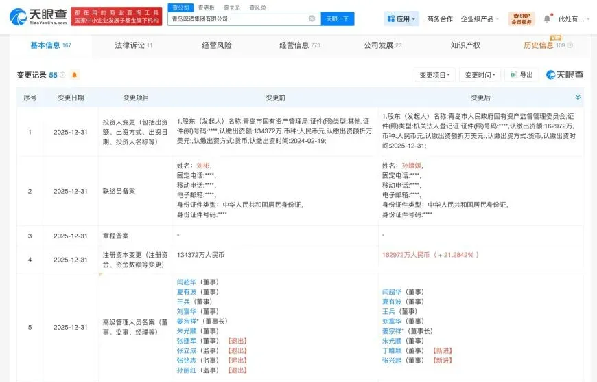 在这一轮工商变更中,青岛啤酒注册资本由约13.4亿元增至约16.3亿元,增幅约21%。
