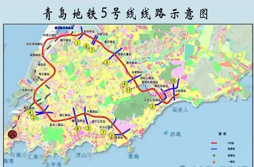 5号线是青岛地铁线网中具有环线功能的“C”型骨干线路,起于麦岛站,止于云岭路站,线路长约32.6公里,共设27座车站,串联8条地铁线路,连接市南区、市北区、崂山区,主要服务邮轮母港及老四方、浮山后等人口密集区。