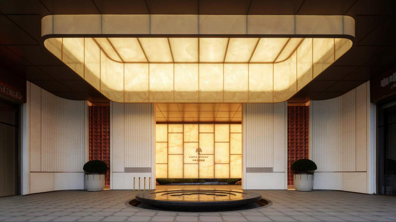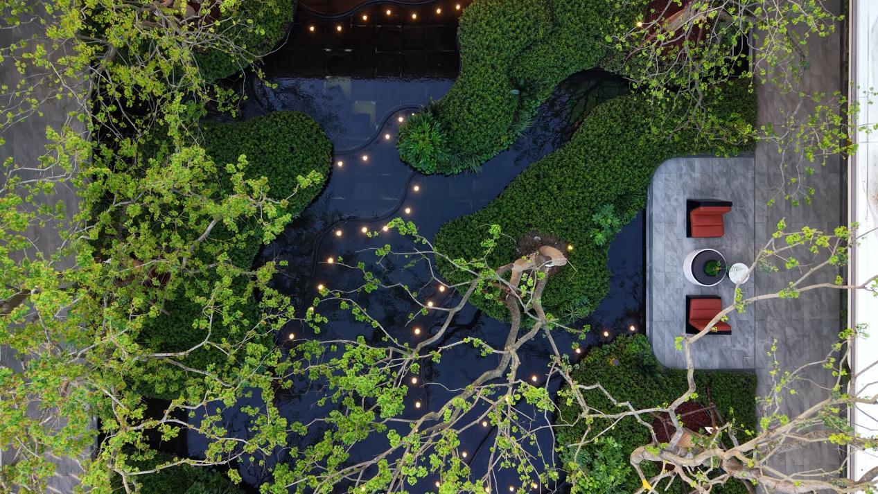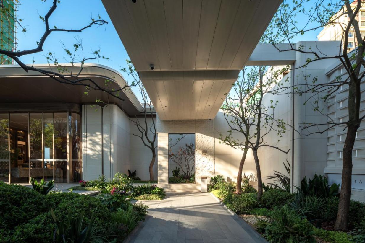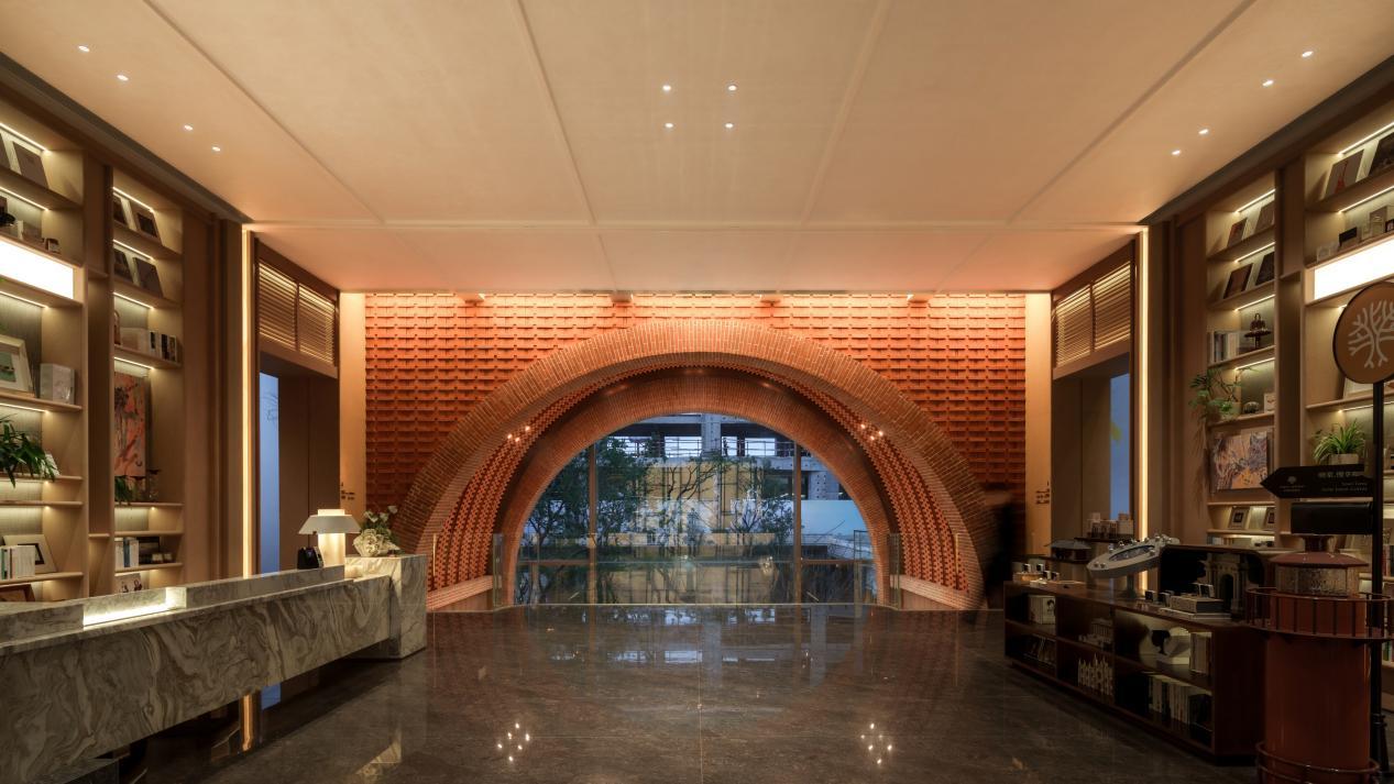 归家即是一场沉浸式园林之旅。媒体团探访时,从步入社区起便被景致吸引:约33米宽、6.6米高的社区大门以中轴对称诠释东方美学,仪式感拉满;穿过门庭,廊架投影的风雨连廊衔接600㎡庭院,静谧水景与乌桕树影相映成趣;行至社区大堂,教堂式英伦风大拱券搭配圆弧玻璃,将下沉庭院景致框成一幅山水画卷,一眼万年,庄重雅致。