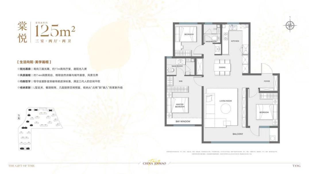 约125㎡户型,以11米南向三面宽搭配7.4米阔景阳台,让清晨的阳光铺满客厅每一处角落;L型玄关的收纳系统,轻松收纳一家人的鞋履与琐碎杂物,让居家空间整洁有序。