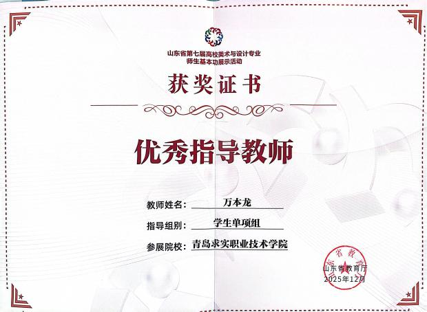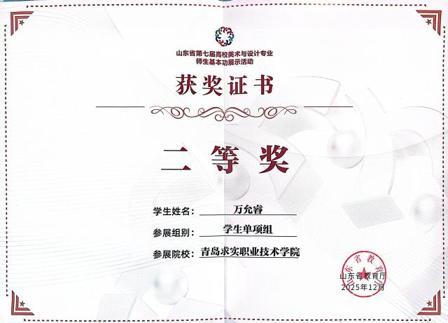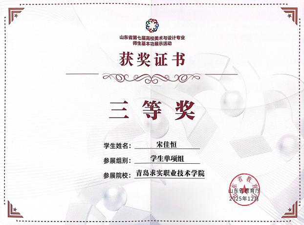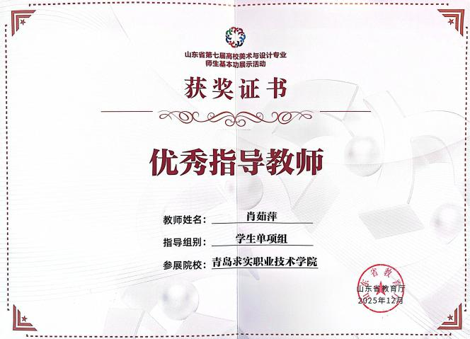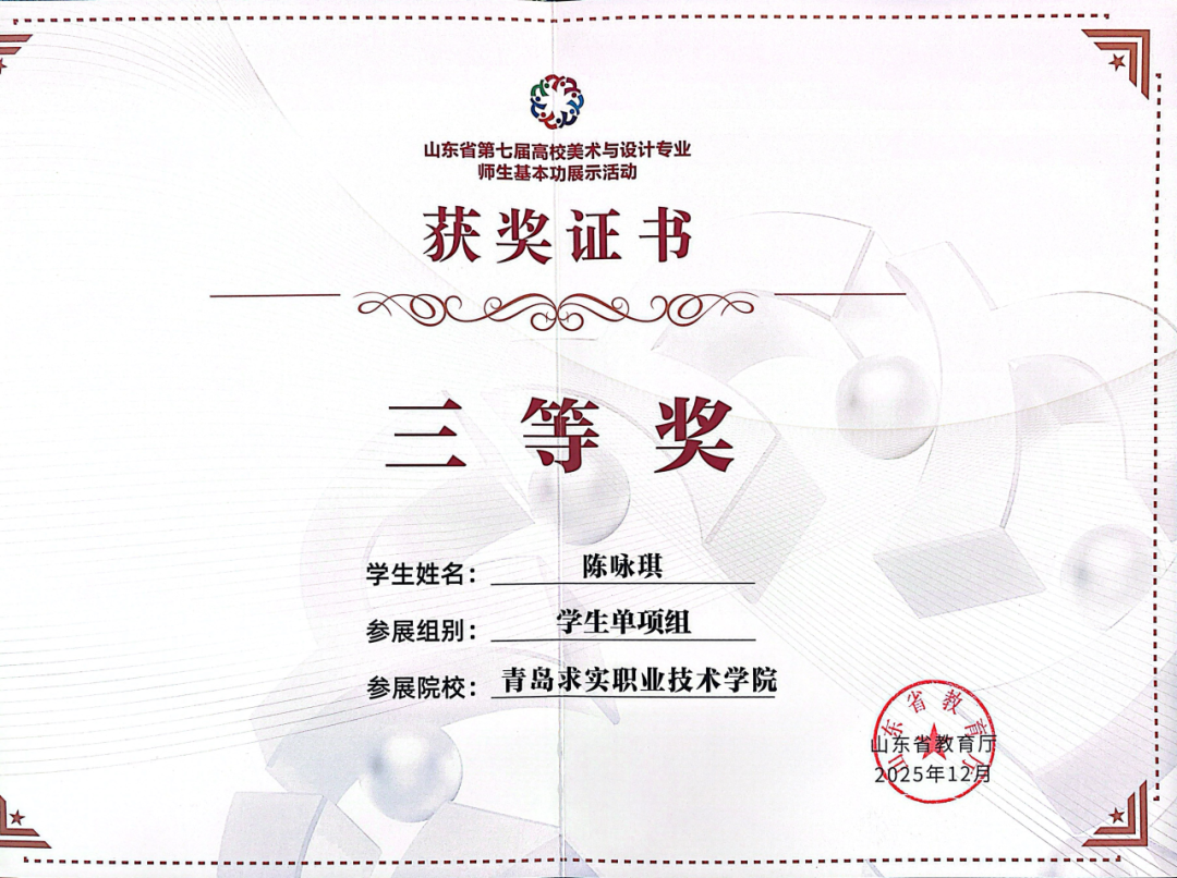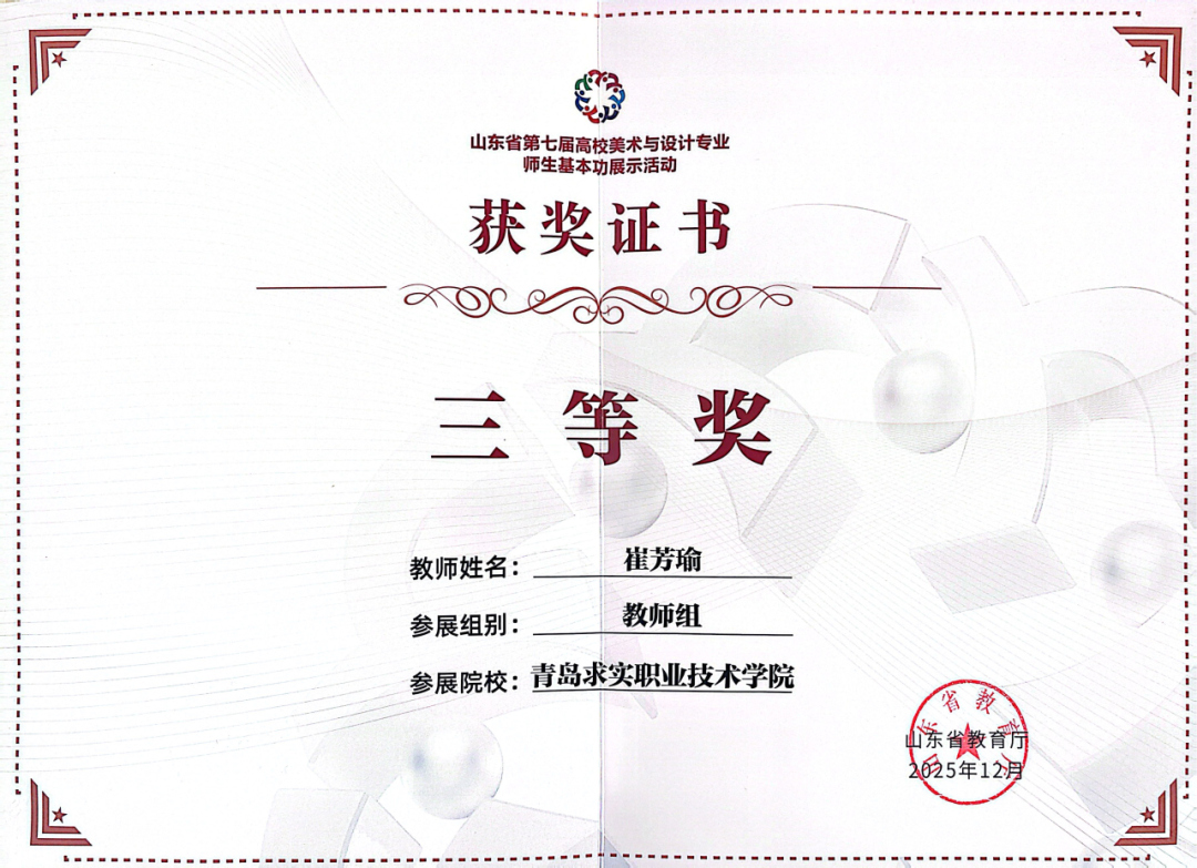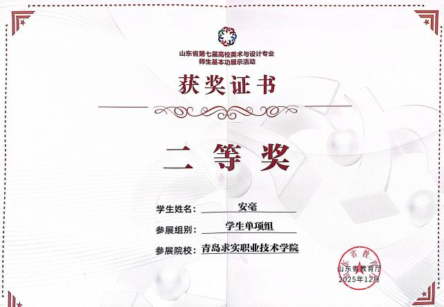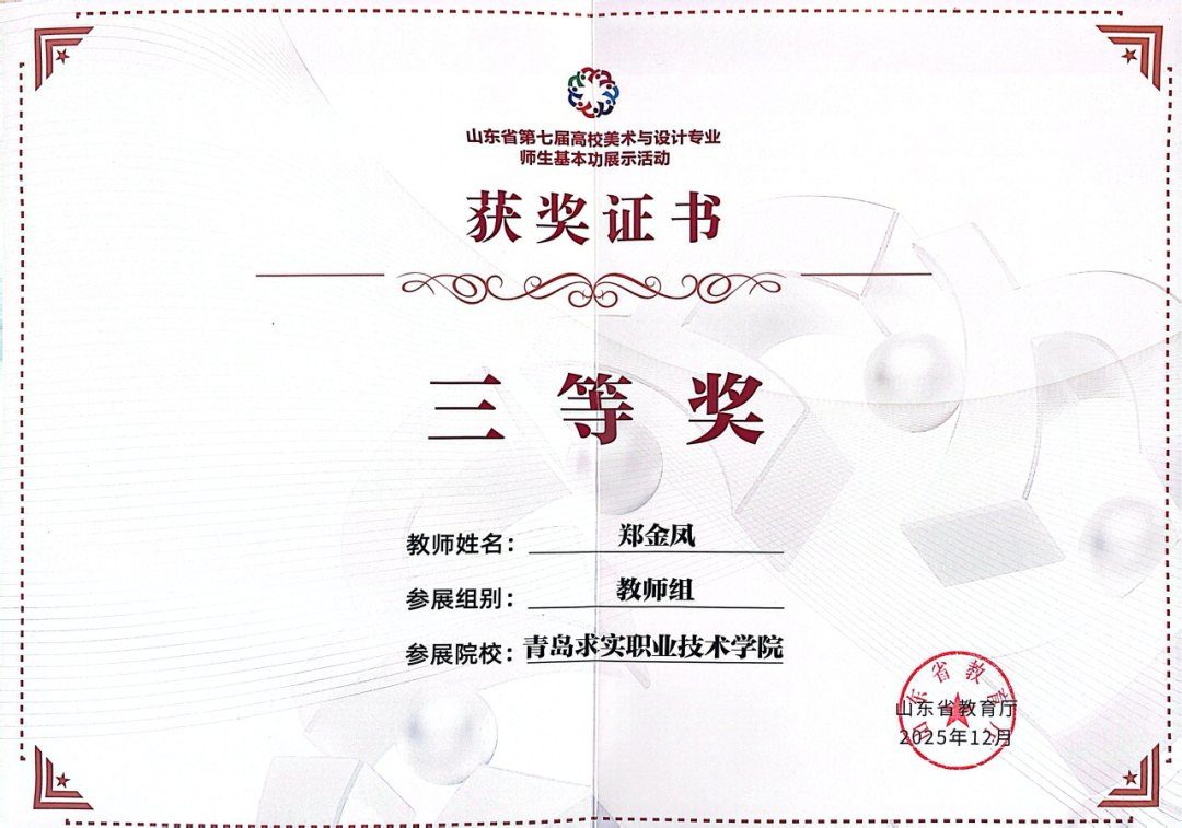 近日,由山东省教育厅主办的“第七届山东省高校师生美术与设计专业师生基本功大赛”成绩下发,此次大赛在山东工艺美术学院举行。青岛求实职业技术学院艺术学院选派的多名师生在比赛中发挥出色,凭借扎实的专业功底和独特的艺术创意,从众多参赛选手中脱颖而出,共斩获教师组三等奖2项,学生单项组二等奖2项、三等奖2项,优秀指导教师二等奖2项的优异成绩,全面展现了我校艺术学院在美育教育与专业人才培养方面的雄厚实力。