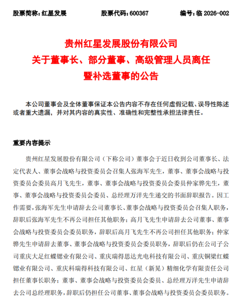 1月12日晚间,贵州红星发展股份有限公司(以下简称“红星发展”)披露董事会决议公告称,因工作需要,张海军先生申请辞去公司董事长、董事会战略与投资委员会召集人职务,辞职后张海军先生不再担任公司其他职务。