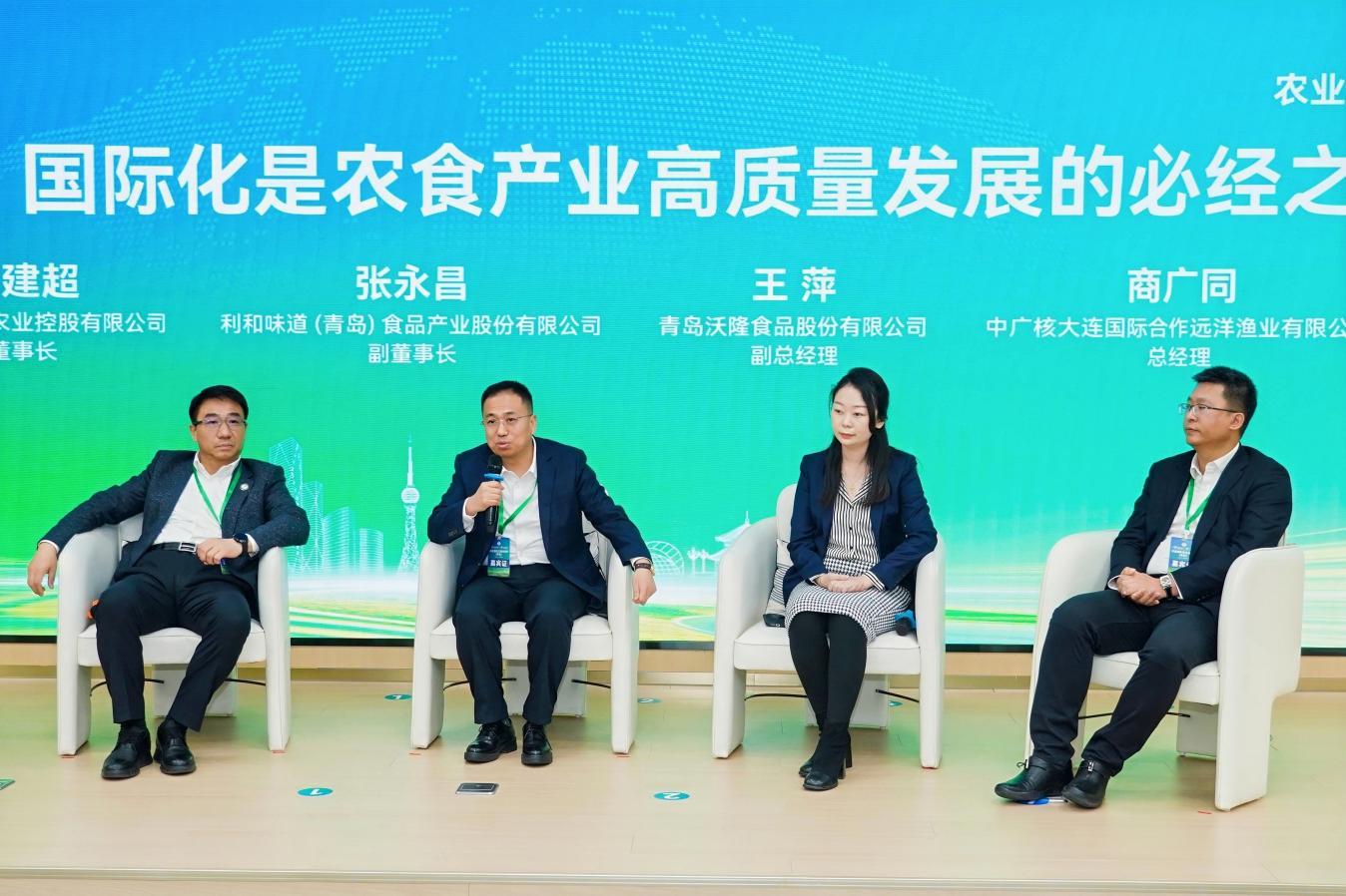 第一组嘉宾佳沃北大荒农业控股有限公司董事长任建超、利和味道(青岛)食品产业股份有限公司副董事长张永昌、青岛沃隆食品股份有限公司副总经理王萍、中广核大连国际合作远洋渔业有限公司总经理商广同,从产业链实践角度,分享了各自企业“走出去”依赖的“钥匙”、面临的困难及需要的支持。