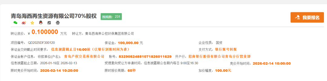 近日,青岛产权交易所发布一则挂牌信息,青岛西海岸公控环保集团有限公司和青岛西海岸公控投资有限公司转让青岛海西再生资源有限公司(下称“海西再生资源”)70%的股权,挂牌底价仅为1000元。