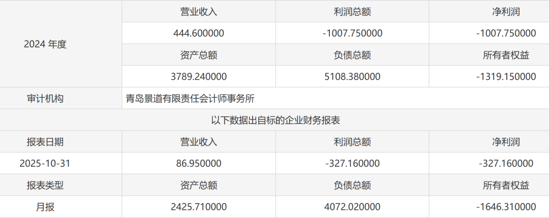 根据2024年年度审计报告,公司全年营业收入为444.6万元,而利润总额却是 -1007.75万元 。进入2025年,情况未见好转,截至10月31日公司营收仅86.95万元,净利润亏损327.16万元,并且亏损仍在持续扩大。这意味着,公司经营活动完全无法覆盖其成本与费用,处于严重的“失血”状态。