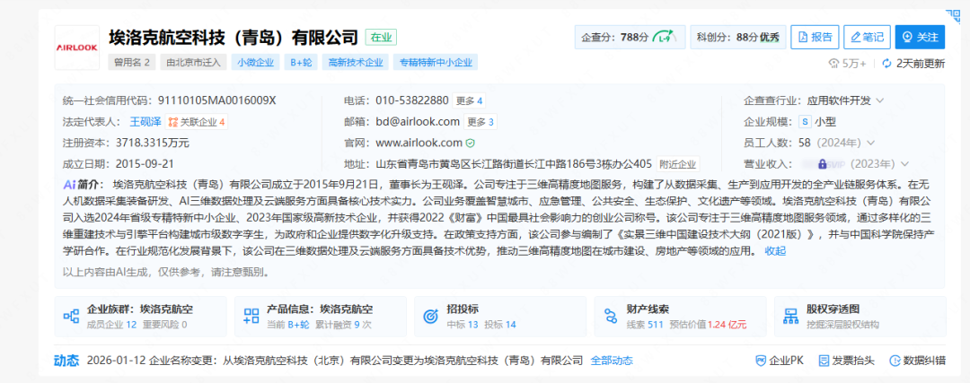 据公开信息显示,埃洛克航空科技(北京)有限公司地址已由北京市丰台区南四环西路变更为山东省青岛市黄岛区长江路街道长江中路;公司名称随之变更为埃洛克航空科技(青岛)有限公司(以下简称“埃洛克航空”)。
