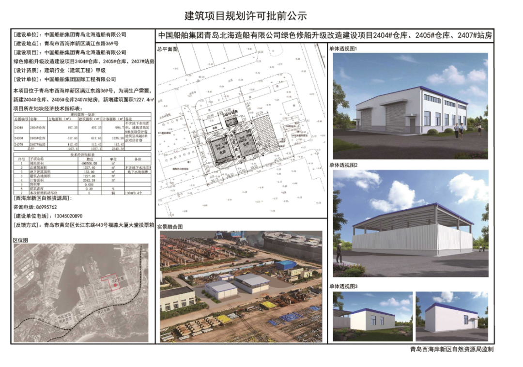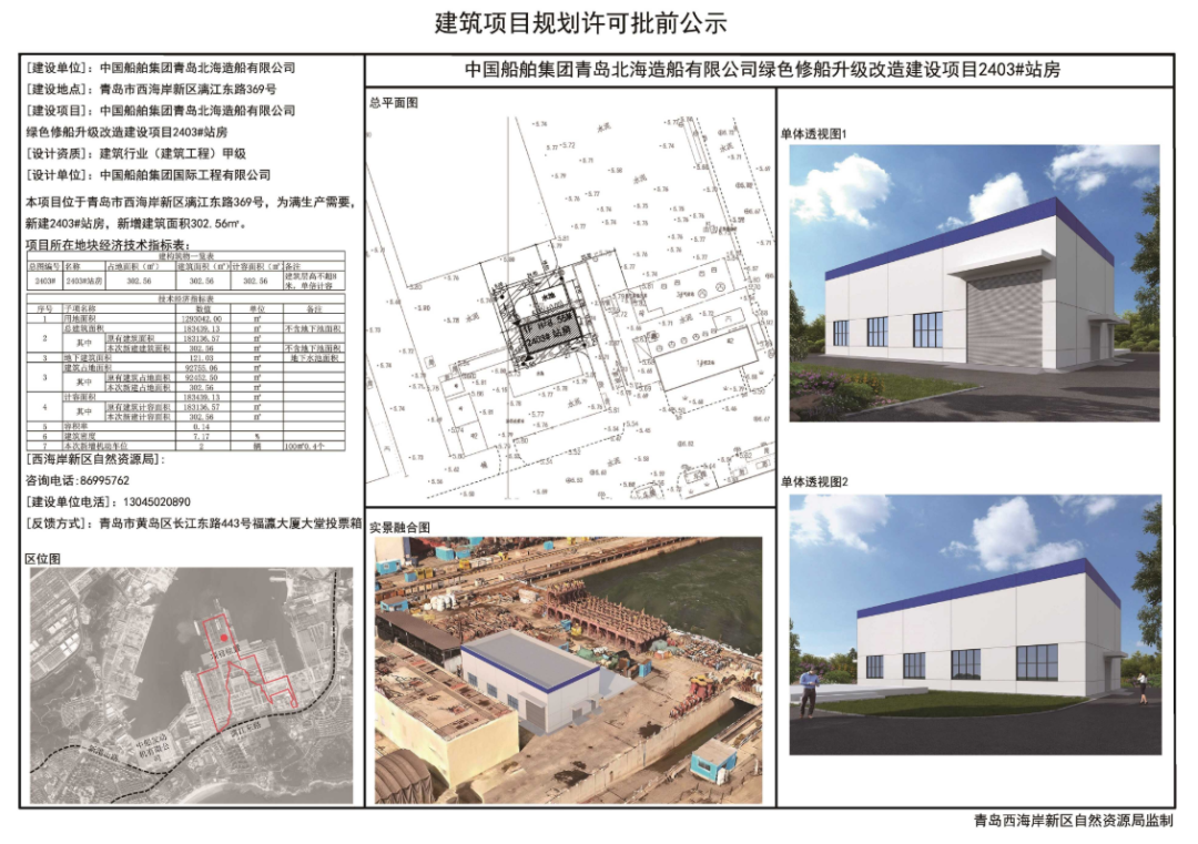 北海造船绿色修船升级改造建设项目包含2404#、2405#仓库、2407#站房及2403#站房4栋规划建筑。其中规划2404#、2405#仓库、2407#站房总建筑面积为1227.4㎡,计容建筑面积为2342.38㎡,建筑密度0.3%,容积率0.006,机动车停车位5个。规划2403#站房,建筑面积为302.56㎡,建筑密度7.17%,容积率0.14,机动车停车位2个。