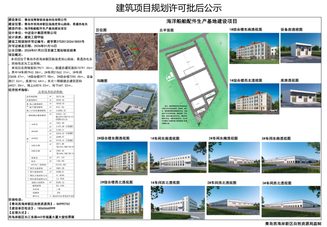 此前,1月16日,青岛宝隽智能装备科技有限公司(以下简称“宝隽智能装备”)的海洋船舶配件生产基地建设项目已成功获得建设工程规划许可证并完成批后公示,成为近期新区船舶产业中规模最大的项目。