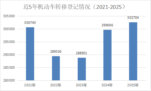近5年,我市机动车转移登记业务呈现高位波动、持续回升的特点,2025年业务量突破30.2万笔创历史新高,二手车交易市场活跃,其中汽车转移登记业务28.3万笔,占93%。